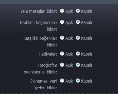 Burada mail etkinleştirme şimdilik temel kural olmaya devam edecek. Çünkü AngelsTurkiye mail kurgusuyla daha sağlıklı çalışır. Tüm kullanıcılarımız bildirim maillerini kökünden kapatabilir. Mail ile bilgilendirme hizmeti bir çok büyük arkadaşlık sitelerinde dahi AngelsTurkiye’deki gibi servis edilmemektedir. Bu maillerin de bir maliyet olduğunu ve tamamen tarafımızca karşılandığını bildirmek isteriz. Bazı uygulamalarda bu servis ücretlidir. Açıp kapatabileceğiniz bildirim mailleri şimdilik alttakiler gibidir. Bu mailler bizler için bir maliyet olsa da dilediğinizi açıp kapatmak size kalmış. Umarım bu özelliği seversiniz.