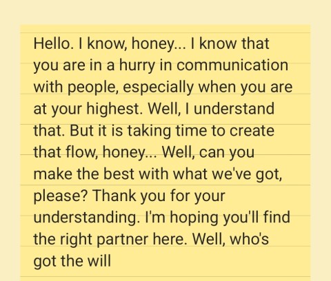 Hello. I know, honey... I know that you are in a hurry in communication with people, especially when you are at your highest. Well, I understand that. But it is