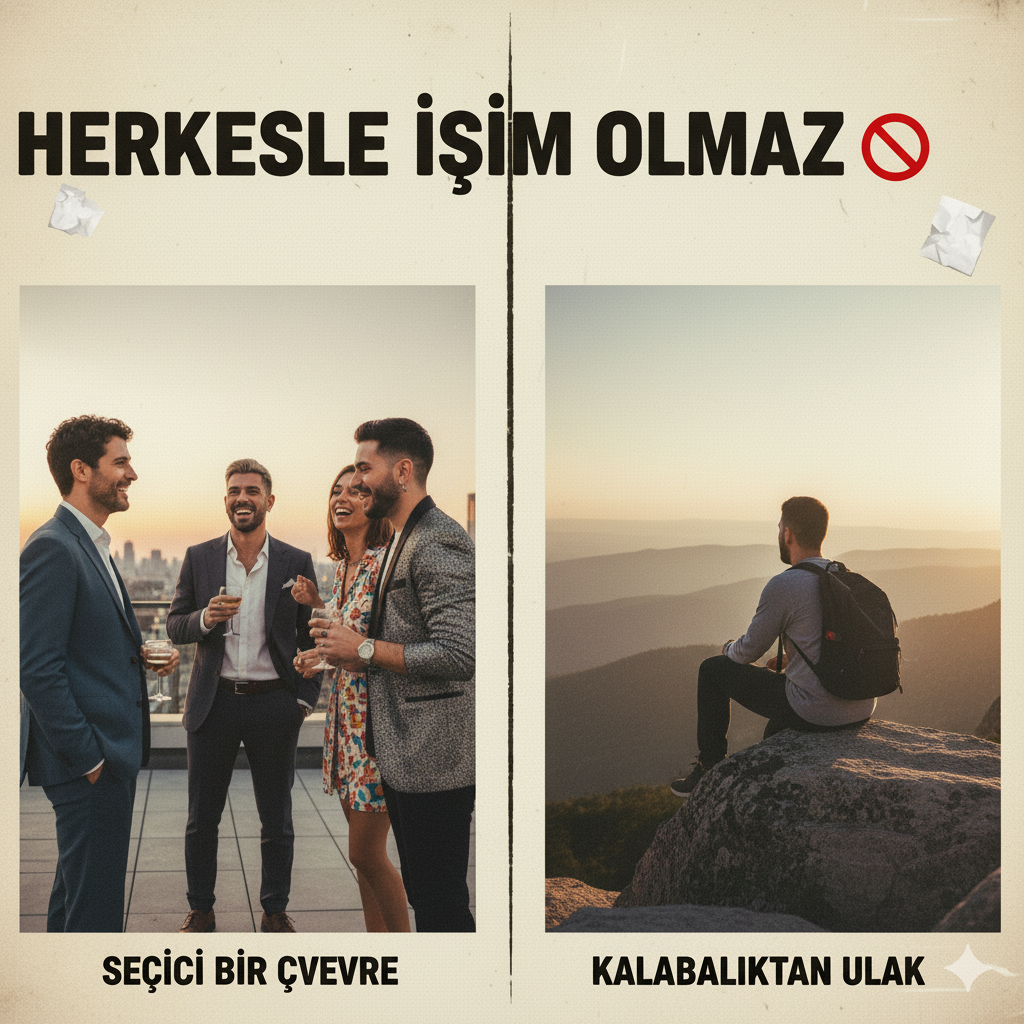 Herkesle işi olmak veya olmamak ne demek ki? Herkes dediğin ne ki… Herkesin çevresinde herkesi vardır. Neyse felsefeyi geçelim. Kendinizi özel biriymiş gibi göstermeye çalışmayan. Herkesle görüşmem deseniz ne, demeseniz ne? Sonuç olarak bunu birine söylemiyor musunuz? Yani herkes olmayan herkesten biri