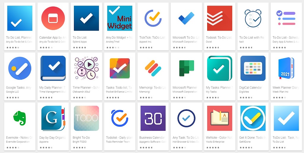 Alttaki görselde Google Play üstündeki yüzlerce to do list (yapılacaklar listesi) uygulamalarının ön izlemesine bakınız. Doğal olarak yüzlerce uygulama söz konusu. Microsoft’un to do list uygulamasını ve Todoist isimli yapılacaklar listesi uygulamalarını ve içlerinden en popüler olan bir kaç tanesini denedim.